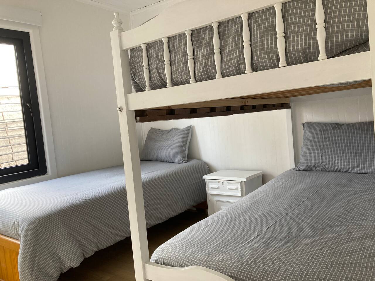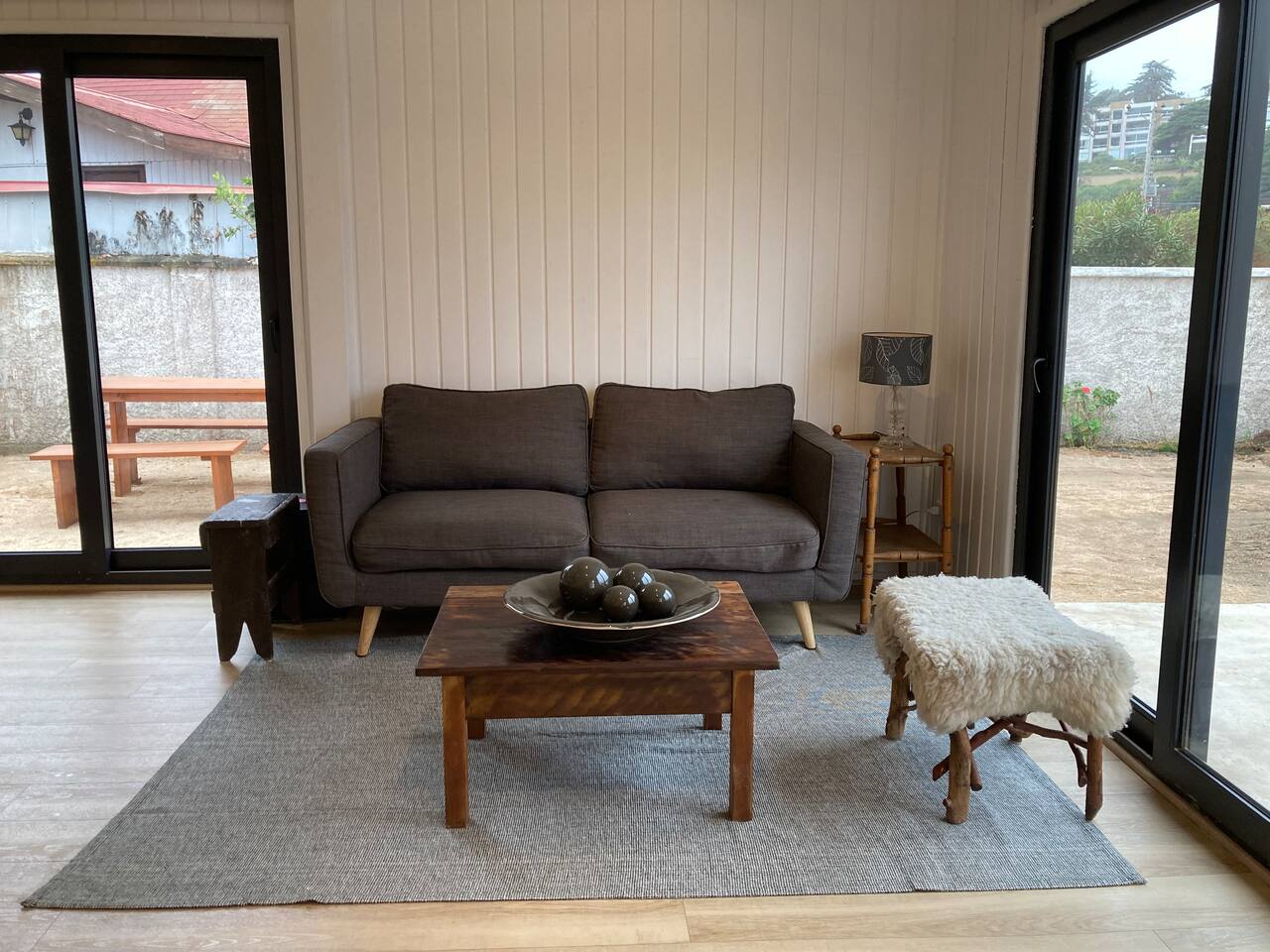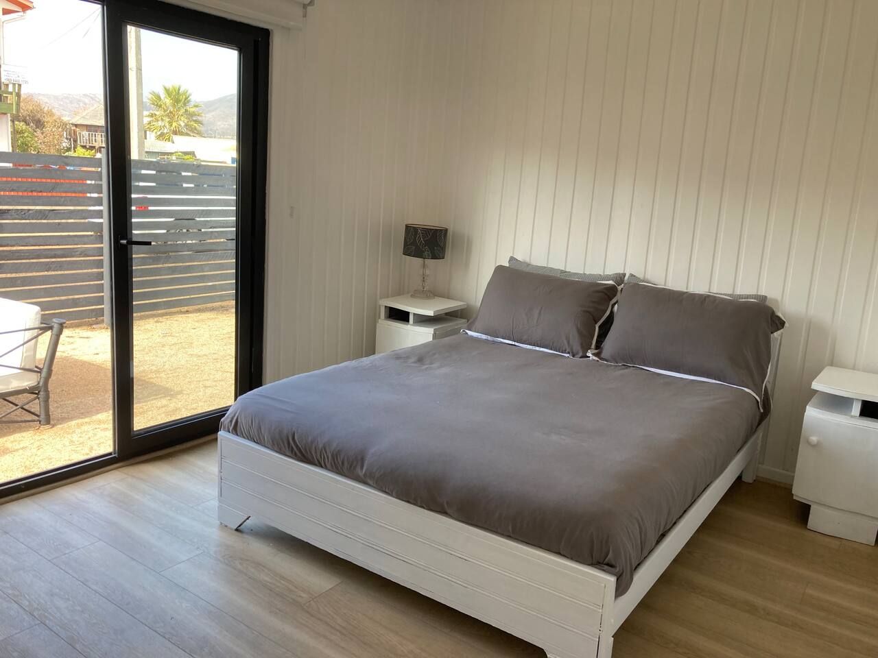 Amplio living-comedor con cocina americana, en la terraza hay comedor y sala de estar al aire libre. − El dormitorio principal tiene una cama king (capacidad para 2 personas). − El segundo dormitorio tiene una cama nido de una plaza (capacidad para 2 personas). El tercer dormitorio tiene un camarote y una cama de una plaza (capacidad para 3 personas). − Un baño completo. − Baño de visitas. La casa está a menos de cinco minutos caminando de la playa y a cinco minutos caminando de la iglesia de Laguna de Zapallar, una preciosa iglesia con vista al mar.