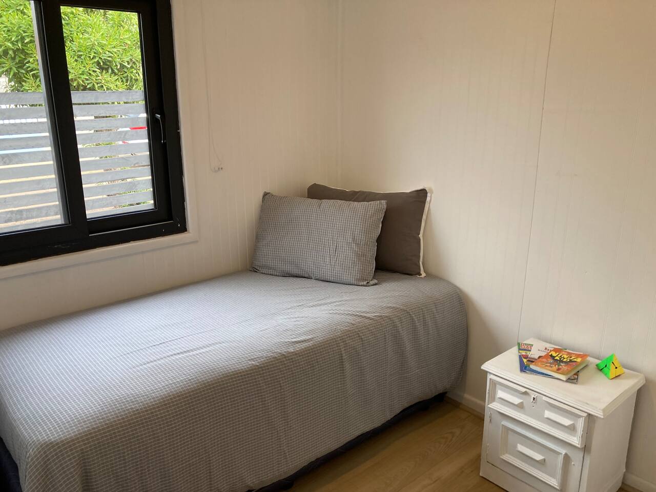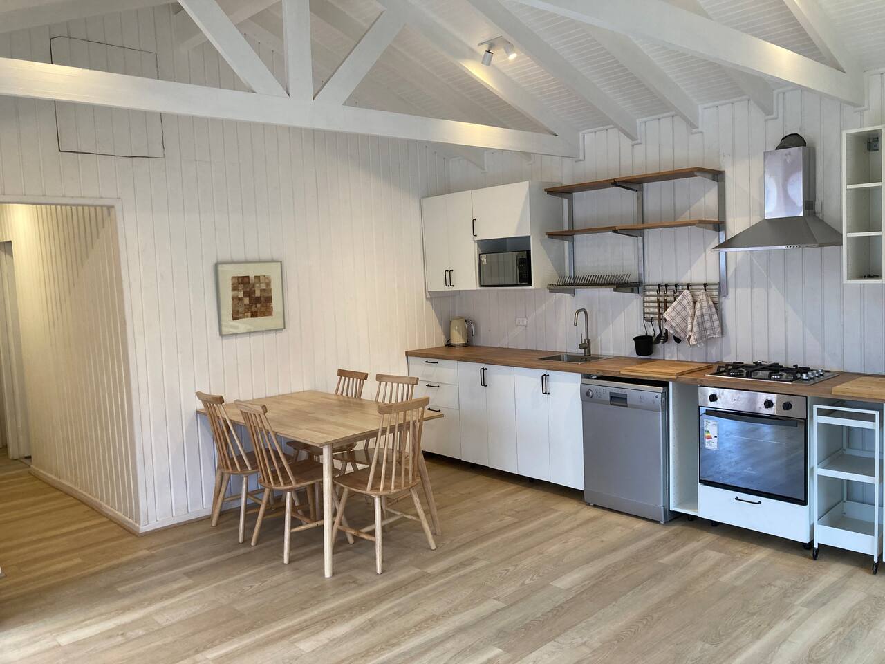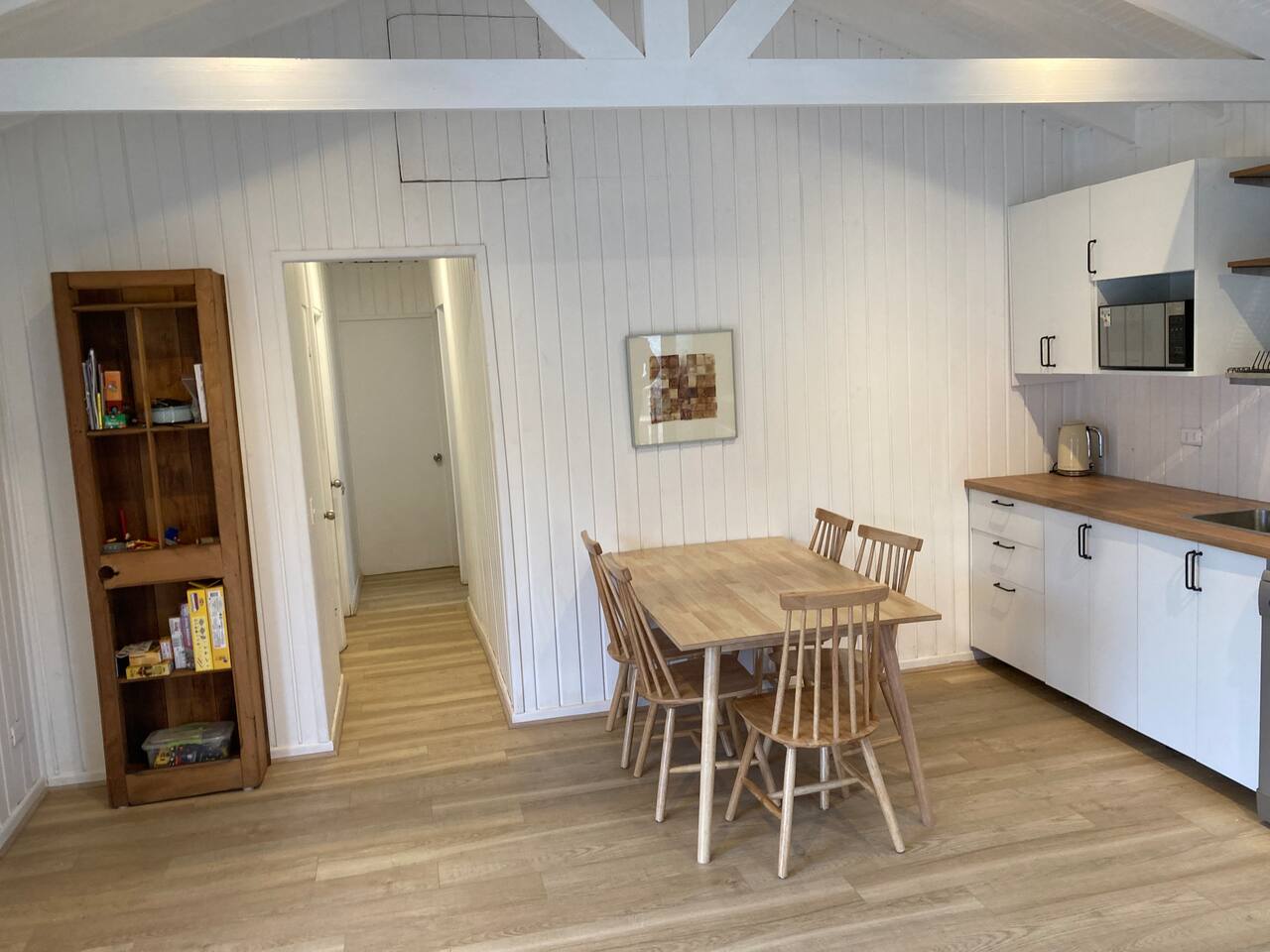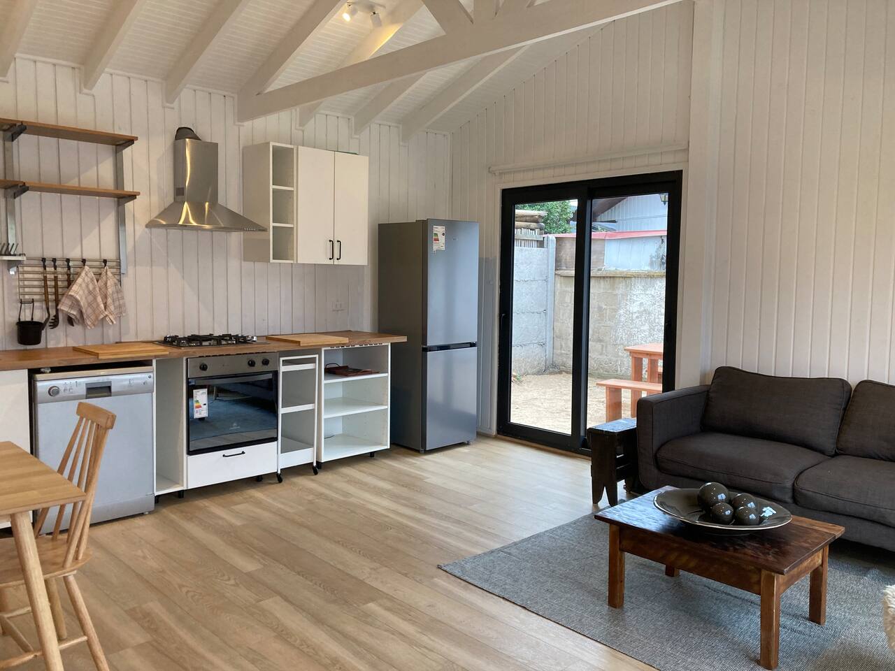 Amplio living-comedor con cocina americana, en la terraza hay comedor y sala de estar al aire libre. − El dormitorio principal tiene una cama king (capacidad para 2 personas). − El segundo dormitorio tiene una cama nido de una plaza (capacidad para 2 personas). El tercer dormitorio tiene un camarote y una cama de una plaza (capacidad para 3 personas). − Un baño completo. − Baño de visitas. La casa está a menos de cinco minutos caminando de la playa y a cinco minutos caminando de la iglesia de Laguna de Zapallar, una preciosa iglesia con vista al mar.